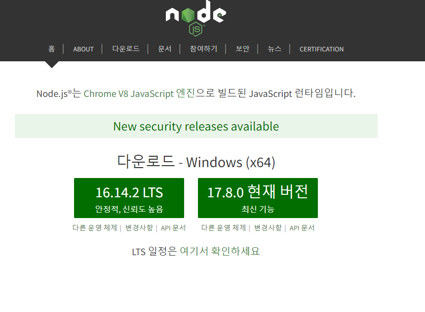 node.js 홈페이지(https://nodejs.org/ko/) 에서 안정적인 LTS 버젼이나 최신 버젼 아무거나 다운로드 한다.