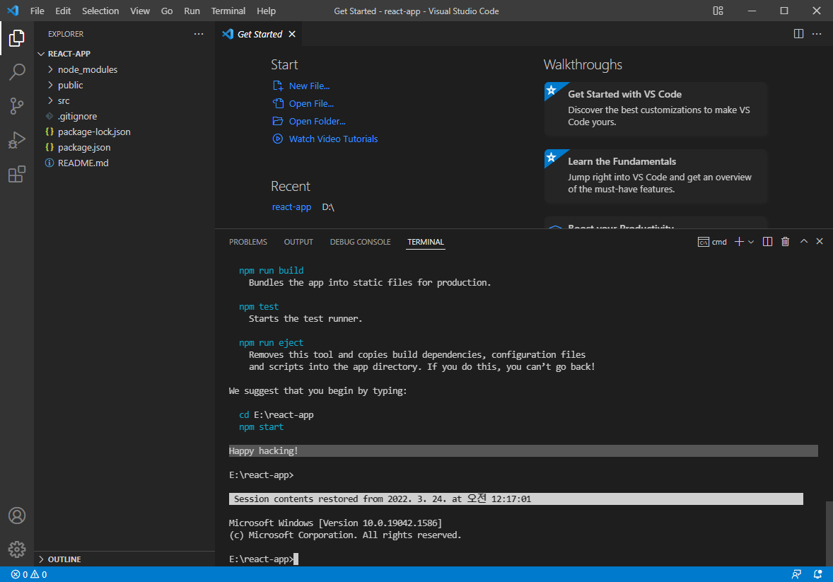 그럼 npm start를 입력하여 제대로 됐는지 확인하자.
