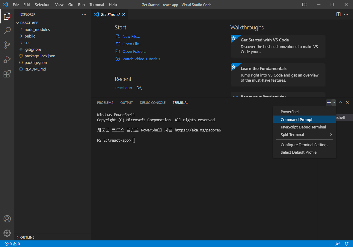 터미널 탭 우측에 + 옆에 아래 화살표를 눌러서 Command Prompt로 변경한다.