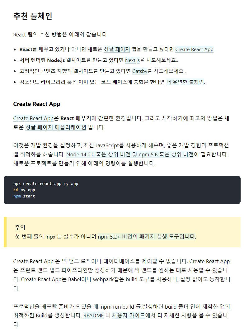 추천 툴체인 이라고 해서 리엑트를 배우는 사람은 create react app 을 사용하라고 추천하고 있다.