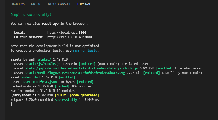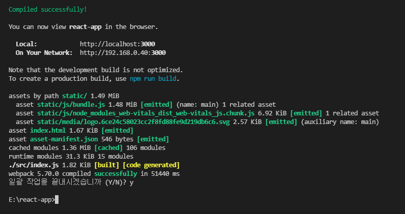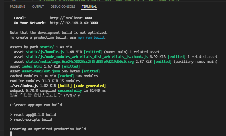 서버가 종료되었다면 npm run build 를 입력하여 소스를 빌드한다.