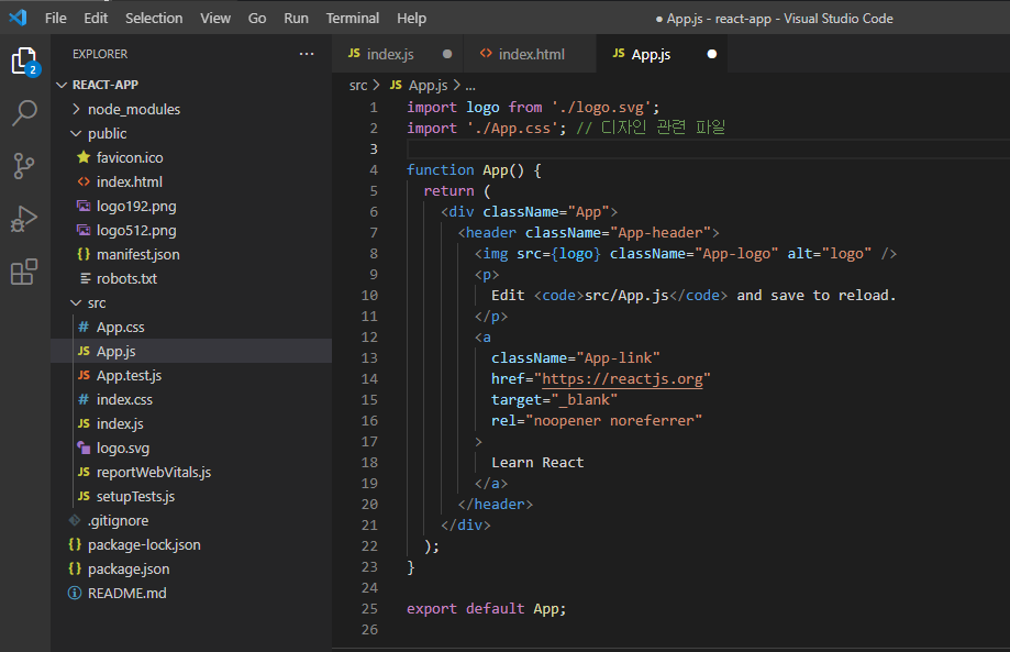 2라인의 ./App.css : 해당 페이지의 디자인 부분 코딩이 포함된 파일