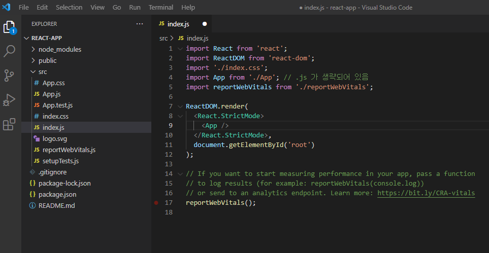 App.js 파일의 6라인~21라인이 index.js에 참조 된다는걸 알 수 있다.