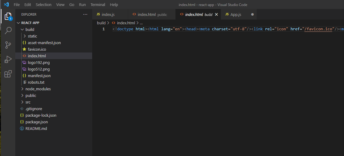 그 안의 index.html 파일을 확인해 보면 html 테그가 일렬로 쭉 나열되어 있는걸 확인할 수 있다.