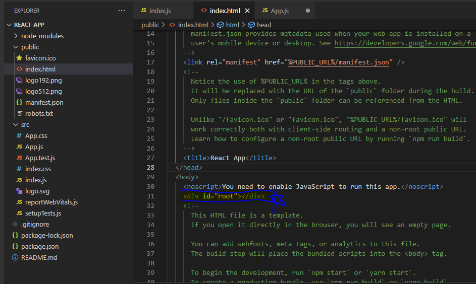 public 폴더 밑에 index.html 파일에 id="root" 가 존재하며, 이 테그에 매핑한다는 뜻이다.