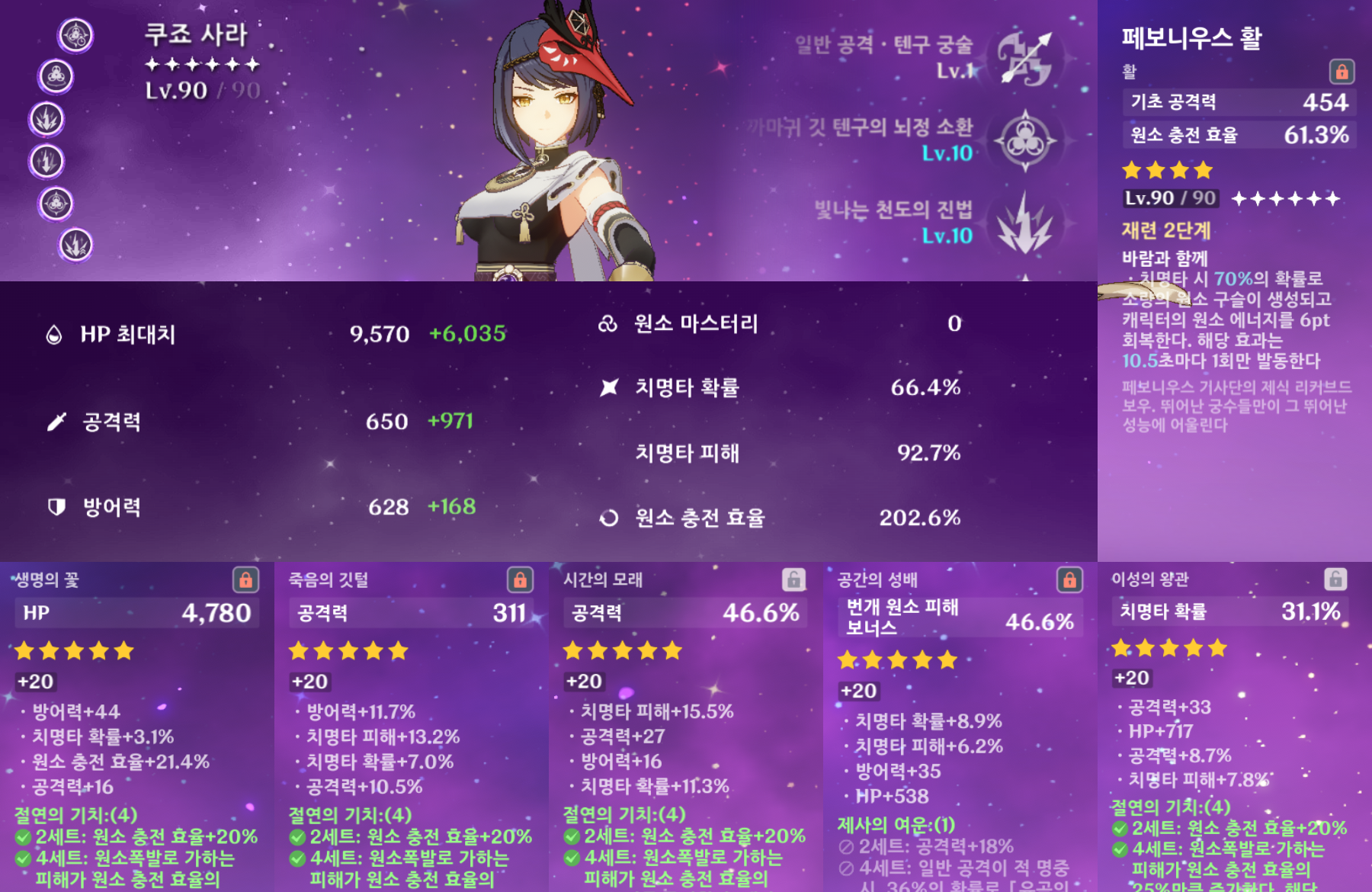 4성 번개속성 활 캐릭터 쿠조사라. 6돌을 찍는다면 번개 메인딜러의 딜을 확실히 높여 줄 수 있는 괜찮은 번개 서포터. 라이덴이 있다면 6돌 쿠조와 함께 딜뽕을 느끼기 충분하지만 그 외에 범용